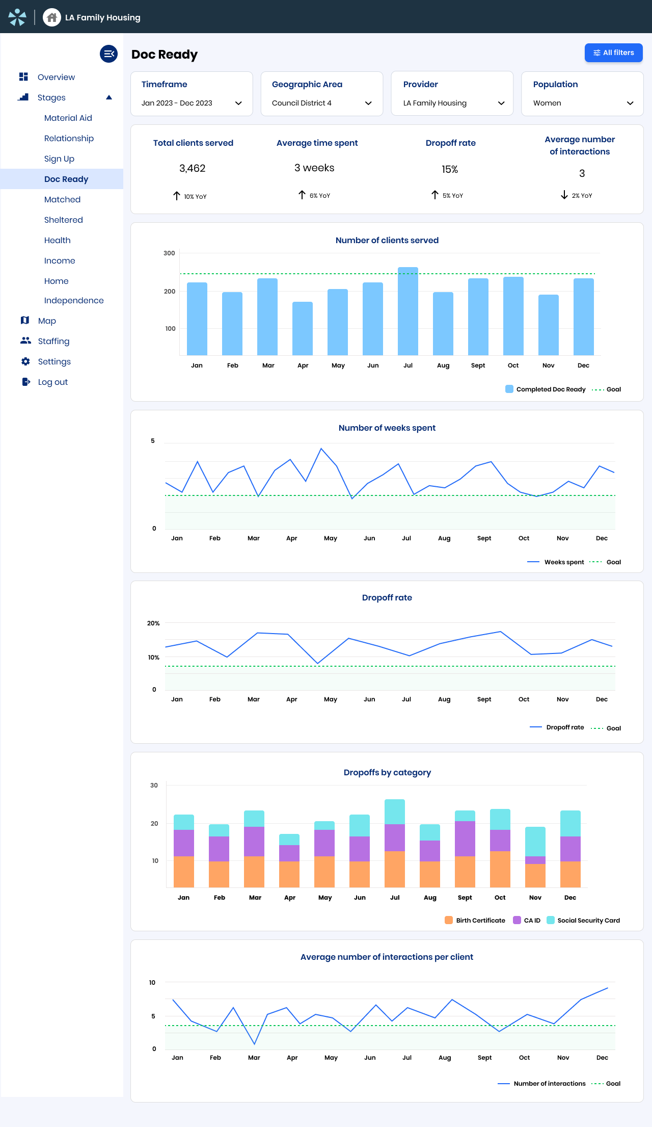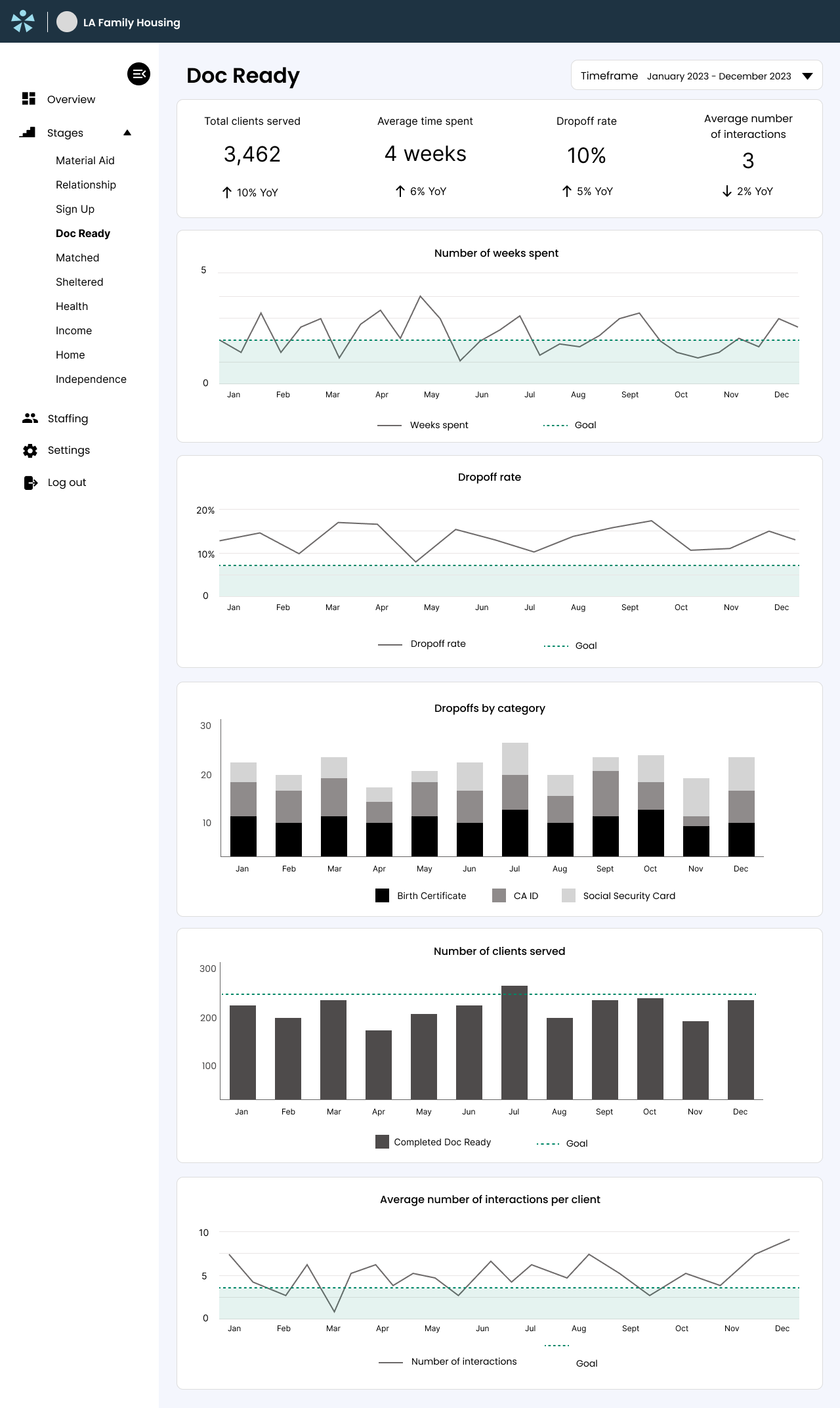 I designed a screen for the “Doc Ready” stage of the outreach process as an example of these stage specific screens. I included charts displaying data over time for each of the metrics that were included on the overview screen. This particular stage also has a multi-part process of verifying the client’s birth certificate, CA ID and social security number, and they may drop out of the process due to any one of these factors, so there is an additional chart for to show the dropoffs by category.
