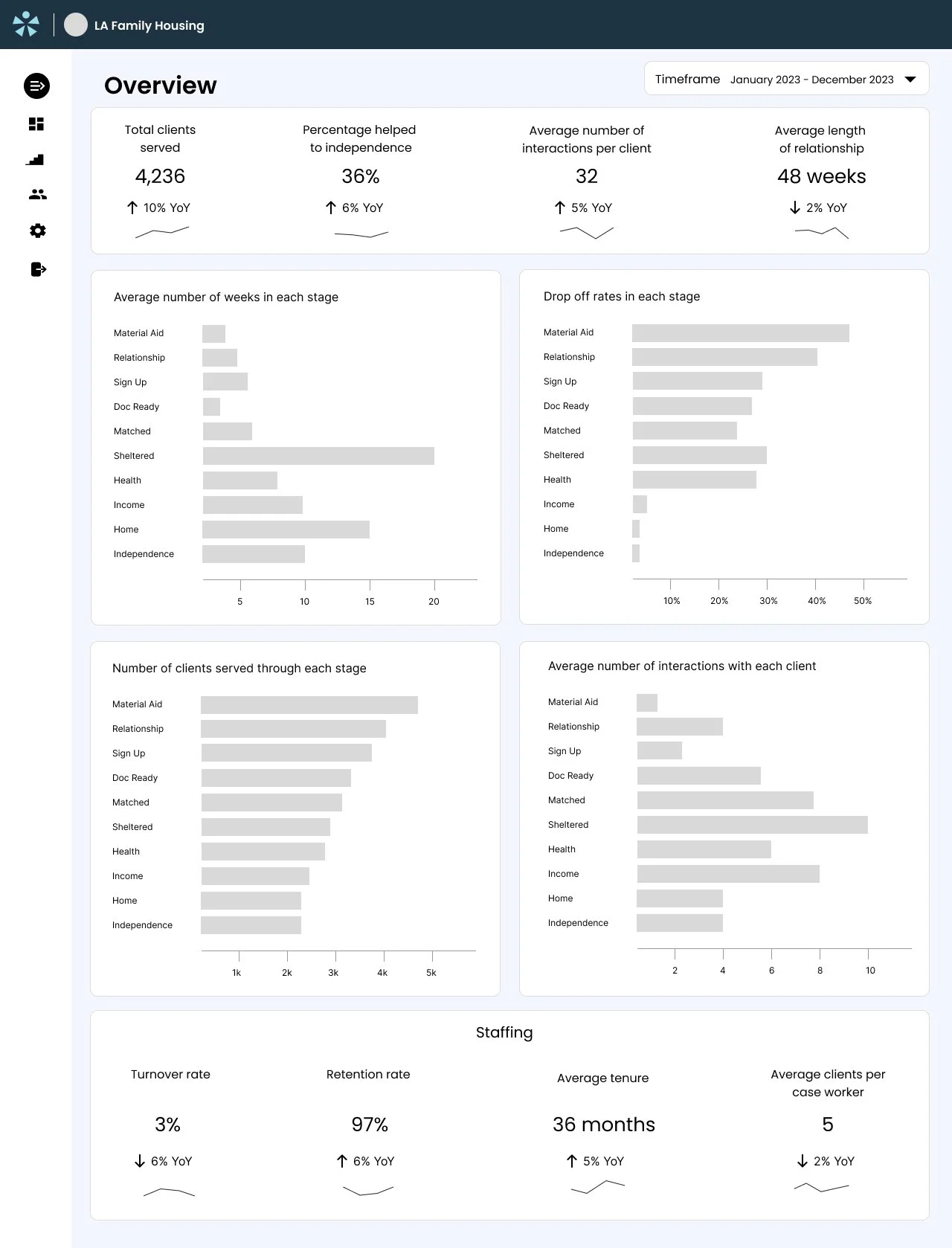 Design a dashboard that helps Better Angel’s client, LA Family Housing, track their performance throughout the different stages of their process, so that they can gain insight into where they can improve.