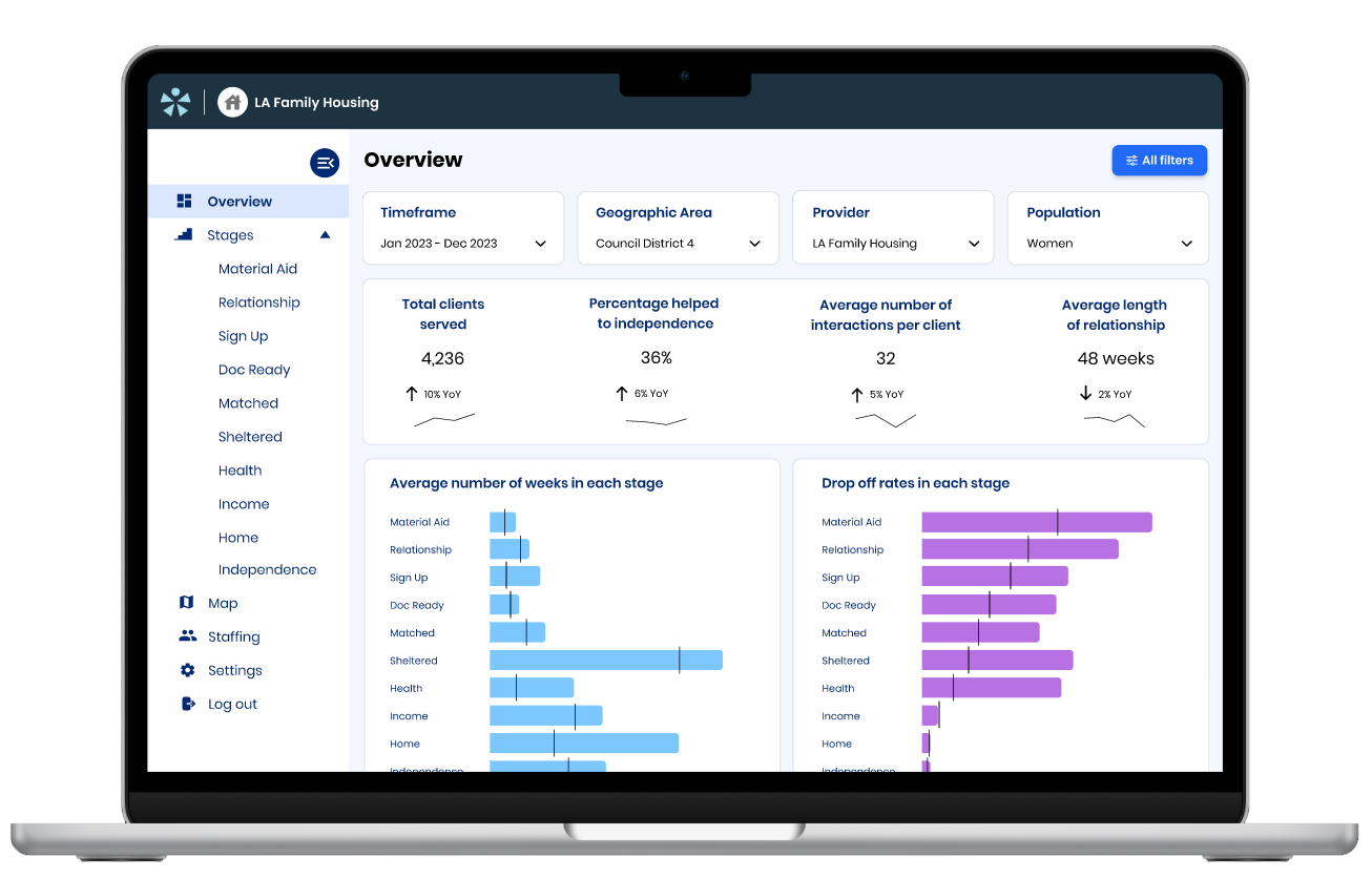 Outreach organizations have a process for helping people transition into permanent housing and achieve independence, but they currently don’t have much insight into the data that will help them improve their performance.
